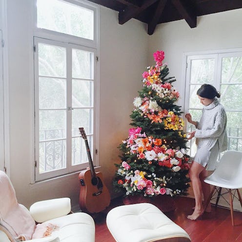 Bri Emery, the mastermind behind LA style studio and blog Design Love Fest, is all about turning your average tree into a work of art. Forgo your usual decorations and tuck in bright florals to form a vibrant spiral garland.