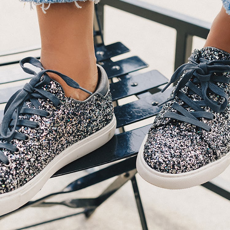 After a few hours dedicated to writing at her desk, Amy steps out for a quick caffeine fix with coworkers at nearby Carrera Cafe. To elevate her jeans-and-tee uniform for work, a moto jacket and fun sparkly glitter kicks do the job.