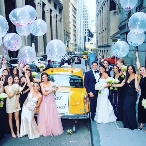 The lovely newlyweds said their "I dos" under a traditional chuppah, with a chandelier of flowers decorating the ceiling. They took to the dance floor, then hopped in a vintage taxi that served as their getaway car.