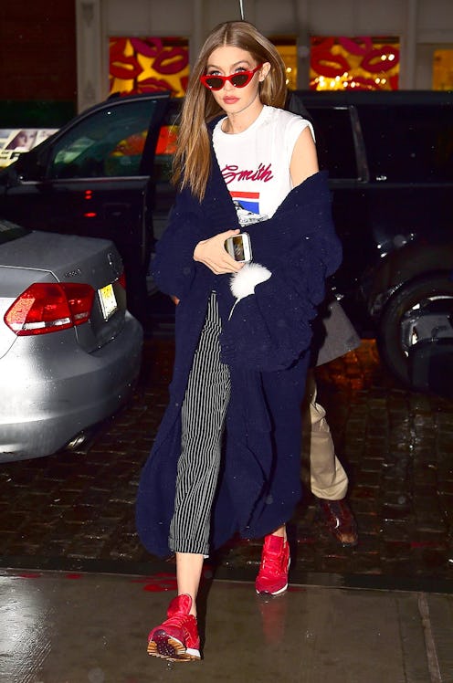 Gigi Hadid in Reebok sneakers, Le Specs x Adam Selman sunglasses, a Winonah cardigan and Diane von Furstenberg pants.