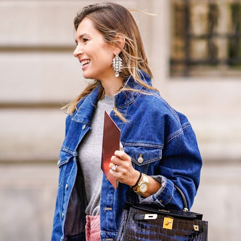For a monochromatic take, classic pieces feel fuss-free as a colorful bag lends a zippy finish.