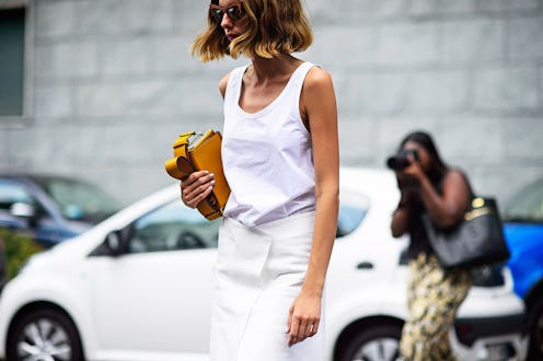 Nothing screams summer dressing quite like layering whites from head to toe. But taking a cue from King Midas and our favorite street style subjects, we’ve opted to level up our monochromatic warm-weather look with golden accessories. An effortless pick-me-up before summer’s end, this touch-of-gold wardrobe trick is flawless with sleek separates in barely-there shades. Here, we’ve rounded up a few key pieces—think: mustard bags and metallic flats!—to get the look.