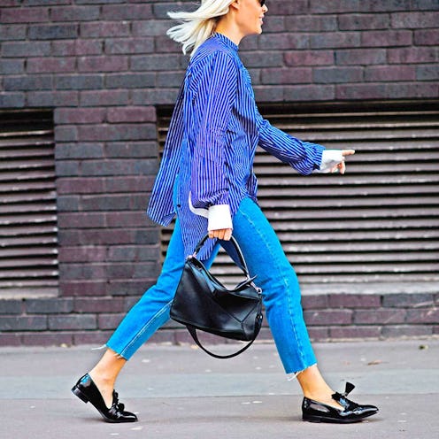 A thin tunic layered over jeans feels entirely fresh when worn partially unbuttoned and teamed with sneakers and neutral accessories—a top-handle mini bag is an of-the-moment choice.