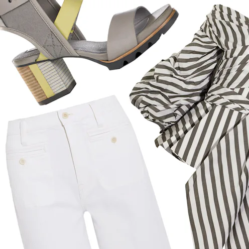 What to wear: The vast metropolitan cityscape in North Texas is home to a flourishing food scene, an expansive arts district and luxury shopping. Select a bright block-heel sandal for fashion-forward flair. An asymmetrical shoulder top with voluminous sleeves adds drama. Temper the look with cropped white denim and finish off with gold statement hoop earrings.
