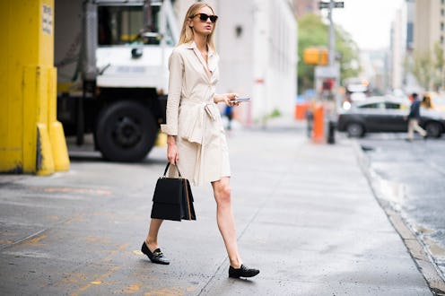 If you have a penchant for color, go for a bright dress in an elegant shape, like a buttoned shirt-dress. Loafer heels lend you an academic vibe, while small gold earrings add an appropriate (read: understated) amount of glitz.