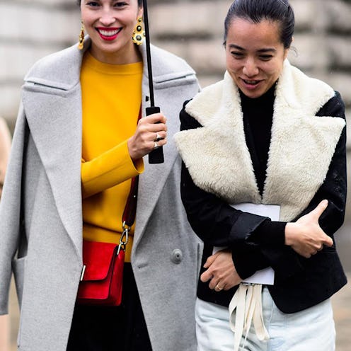 Some pitter-patter on the windowsill shouldn't lead to canceled plans. Simply layer a fitted long-sleeve sweater underneath your party dress and protect your ready-to-dine-and-dance number with a long belted coat. Opt for patent leather pumps that are easier to clean and finish off with a blingy gold metallic cross-body.