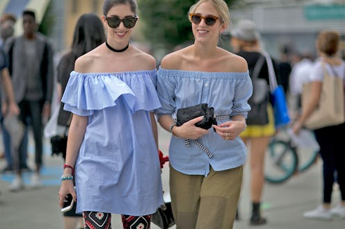 If you are apple-shaped or tend to carry weight at your waistline, opt for the ubiquitous off-the-shoulder top. Its roomy silhouette skims the tummy and focuses the attention on your upper body.