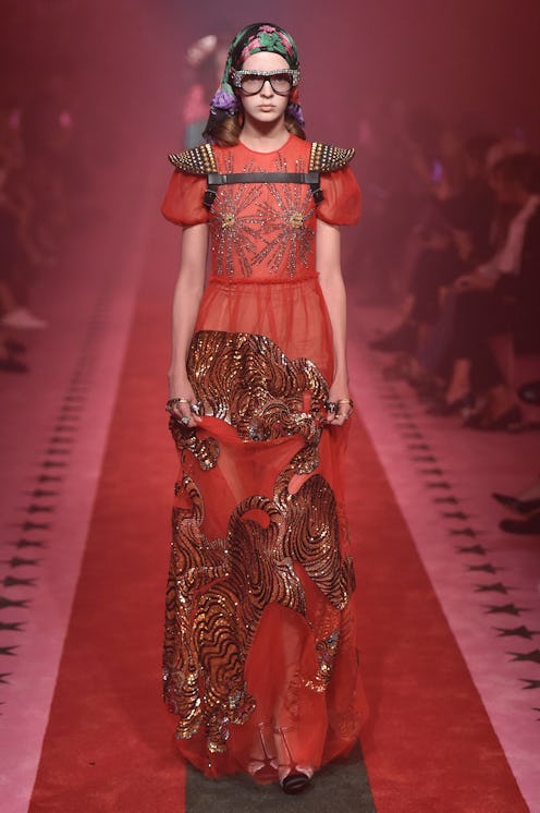 Alessandro Michele’s Gucci is a fantastical world of color, texture and intrigue—one that fashion lovers everywhere have flocked to since his induction as creative director in January 2015. The Spring 2017 collection, which just debuted at Milan Fashion Week, is an extension of the lively aesthetic he’s cultivated throughout his tenure—think serpents, sequins and studs, in addition to frothy ruffles aplenty. Quirky glasses (one of Alessandro’s signatures) and headpieces were seen throughout to drive home the geek-chic vibe. Here, the seven looks we can’t get over (rest assured, it was nearly impossible to pick favorites).