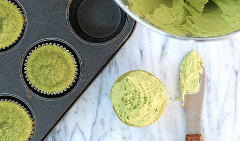 Cupcake ingredients: 1 box TJ's Vanilla Cake Mix 1 cup cold milk 2 large eggs 1/2 cup (1 stick) unsalted butter, melted 4 TJ's Single-Serve Matcha Green Tea Packets