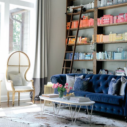 This one isn't for the neat freaks. If you own a bookshelf that's separated into square chambers, try setting up sections by color, but don't get precious about stacking—jam in similarly hued titles at all angles, just be careful not to damage your books. It may not be traditionally tidy, but monochromatic clusters keep the look chic.