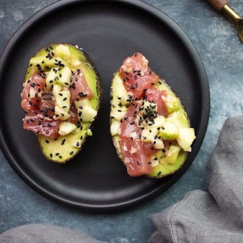 Anya Kaats of Anya’s Eats created this dish to satisfy her sushi bowl cravings, filling her avocados with tuna, macadamia nuts, cucumbers, sesame seeds, and sesame oil. Your Instagram and your taste buds will thank you for this one.