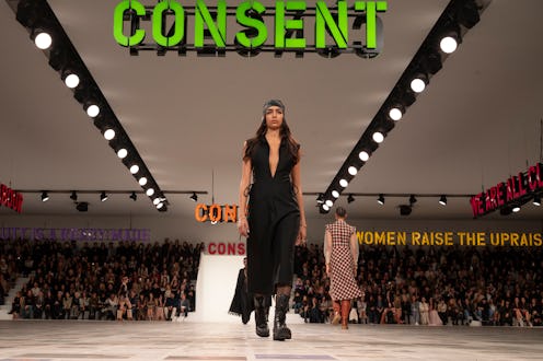 Dior's Maria Grazia Chiuri isn't one to shy away from a bold statement. For the designer's inaugural show for the Spring/Summer 2017 season, she debuted T-shirts emblazoned with the phrase "We Should All Be Feminist," proving that she wasn't going to just grin and bear the tension of the bureaucratic status quo. And for Dior's Fall/Winter 2020 runway show during Paris Fashion Week — which took place on Feb. 25, also during an American election year — Chiuri wanted you to know she's still not satisfied.
