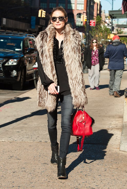 Faux-fur vests have been winter-wardrobe mainstays for as long as we can remember and, as demonstrated by Olivia Palermo, the trend shows no sign of abating. Why? Perhaps it’s the chance to infuse even casual staples with over-the-top glamour, or the guarantee of much-needed warmth you just can’t get from an average layer. Whatever the reason, don’t venture further into the season without at least one option in your arsenal. Whether you layer it over a flowing blouse and skinny jeans, or pair it with your winter coat for a posh, furry accent, the result is decidedly stylish.
