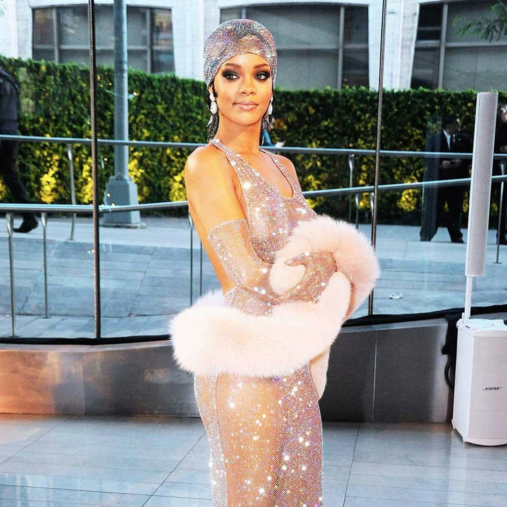 Okay not literally. While we admire RiRi’s nearly nude, bedazzled gown, a cocktail length dress is a feasible interpretation when paired with a faux-fur stole—you'll no doubt shine bright like a diamond (we had to!) with a similarly shimmery effect.