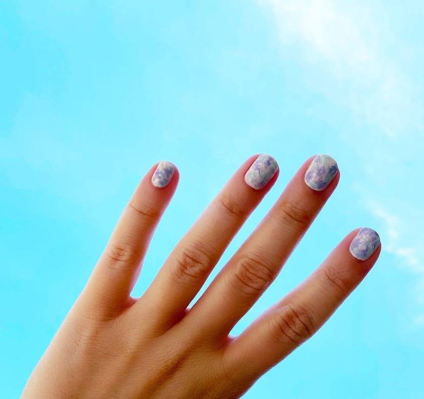 "I've been doing a lot of swirly psychedelic tie-dye looks," Miss Pop says. "I recently created the look in partnership with Nailtopia and have been loving it since." To recreate the look, simply take three to four colors of your choice, dotting all over the nails, and blending together with a small nail brush.
