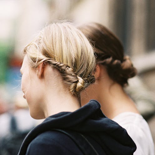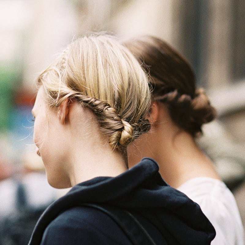 For a quick fix, try a twisted updo. Start by taking a section of hair from behind your ear and twist it toward your scalp. Gradually add pieces as you go, securing each section with a bobby pin. Repeat on the other side until the sections meet in the middle. Be sure it's not too smooth—small bumps and flyaways make this twist cool.