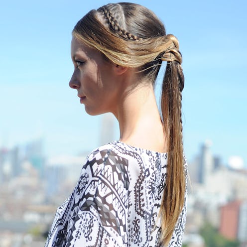 With the crossing sections, create a new braid and let it hang down the pony. Secure with an elastic and spritz with a shine spray.