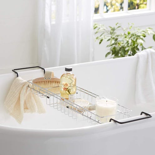 One easy way to take your bath game to the next level: invest in a bathtub caddy tray. Made of rust-proof steel with a chrome finish, this one has a cool, vintage look, plus room for everything you'd want to take into a bath — namely, a drink, a book, a candle, and a few products for pampering. This expands a few inches, so it should fit most tubs nicely.