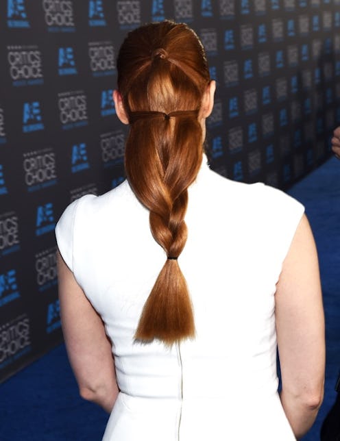 It’s official: the rule-breaker beauty award of the 2015 red carpet season goes to Jessica Chastain, who took the idea of a painstakingly tousled and thoroughly hairsprayed award show braid and threw it right out the window. Part ponytail and part traditional three-strand braid, this hybrid hairstyle makes us want to fast-forward to the weekend, when we can rock this messy-pretty look with our slouchiest jeans and most worn-in tee. Feel like copying it too? Here’s our quick tutorial for achieving the look.