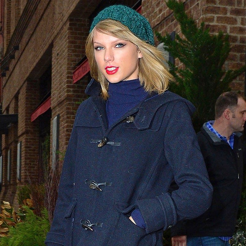 Yes, short-haired girls can wear beanies. Taylor keeps her lob perfectly sideswept underneath her knit chapeau.