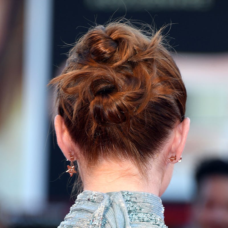 For the Venice Film Festival, L’Oréal Paris Celebrity Hairstylist Mara Roszak created an edgy undo for Emma's red carpet look. Mara split her hair into two even parts and stacked them on top of each other as two ponytails. She then twisted them into loose buns to complete Emma's 'do.