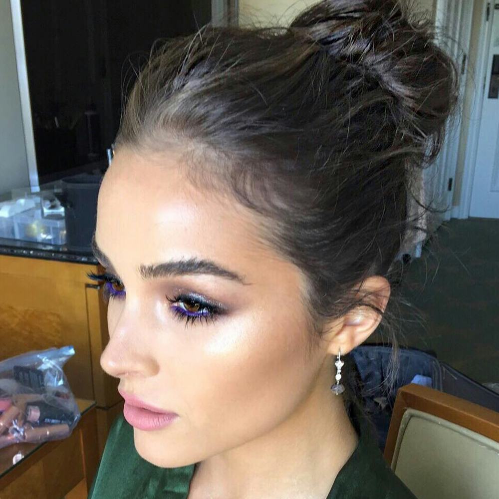 L’Oréal Paris celebrity makeup artist Sir John was responsible for Olivia’s electric purple look. He kept it subtle above the lid, then dabbed glitter right across and used neutral shades beneath the brow bone. Bright purple eyeliner across the waterline added a contrasting, exotic effect, and false eyelashes and mascara made her eyes pop.