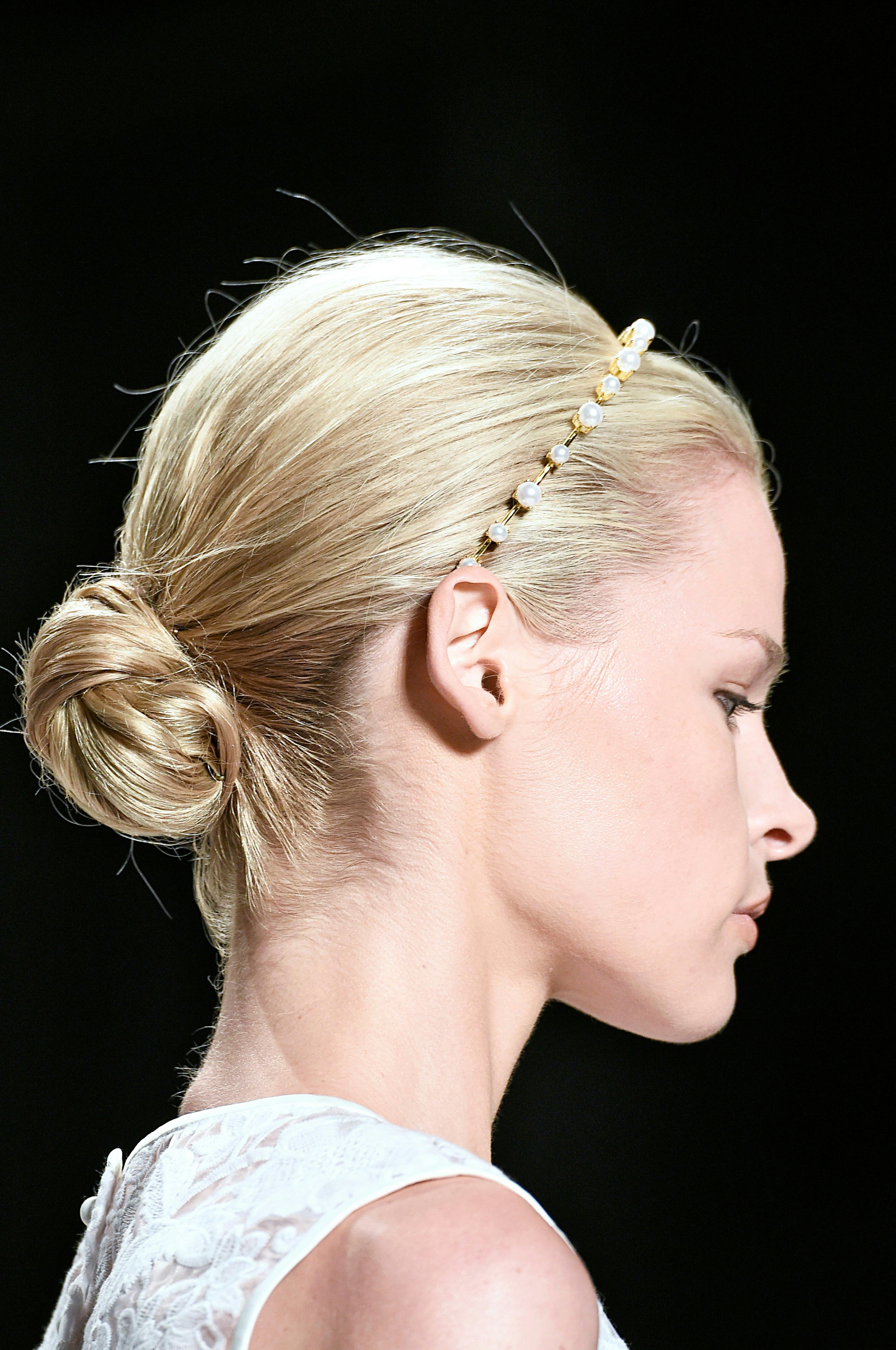 Behold! A chef-friendly hairstyle that also happens to be effortlessly gorgeous. We adore the look of a slicked back, low bun topped off with a sparkling hair accessory. This fuss-free updo is great for working in the kitchen: You won't have to keep brushing your hair out of your face or—gasp—take the risk of a loose strand making it sway into the stuffing! (Just remember to finish the look with plenty of hair spray and bobby pins for extra security.)