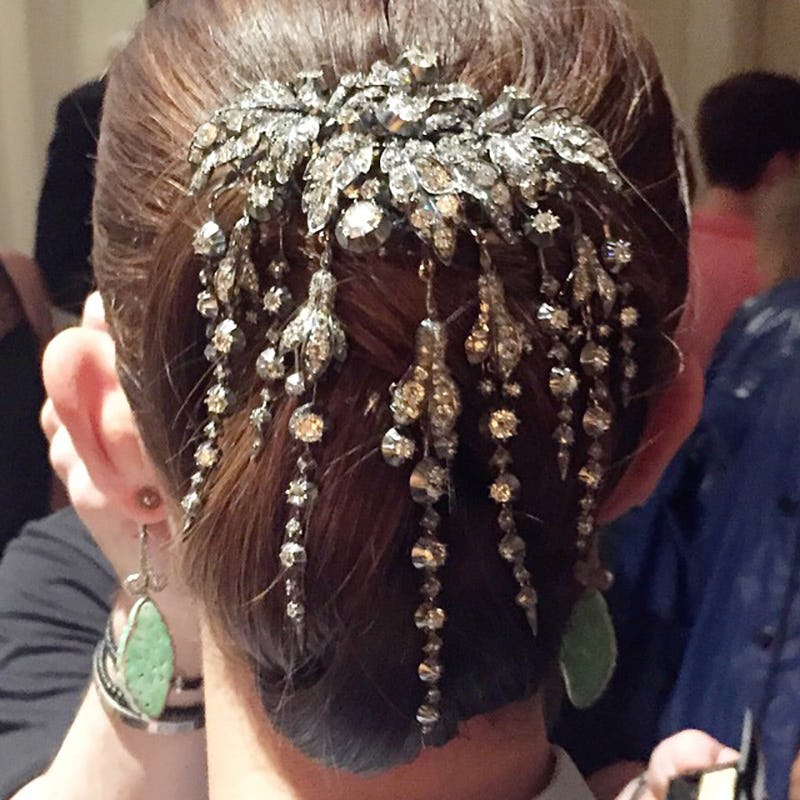We're obsessed with the cascading Stephen Russell diamond brooch Lily Aldridge added to her updo.