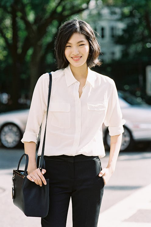 Experimenting with faux bobs, layers or bangs can be the perfect way to feel out a shorter style. To get faux bangs, Paul advises to “pull hair into a high ponytail and secure with an elastic. Split the base in half to get a top and bottom. Pull the top half toward the forehead to create the look of bangs and pin in place at the crown. Tease the base of the ponytail and wrap into a topknot. Pin in place.” Voila. Take your new 'do for a spin to figure out if you really like it.