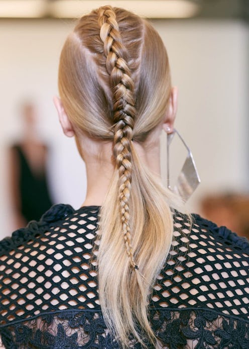 It’s the first day of New York Fashion Week (talk about humidity levels) and the beauty inspiration is already rolling in! Whether you’re battling humidity or a bad hair day, look no further than this hairstyle for a sleek and simple answer to your woes. Simply start with an anti-frizz serum then re-create this French braid-ponytail hybrid as seen on the Victor Alfaro Spring 2016 runway. Separate hair into three sections and pull the two outer sides into a low ponytail. Braid the middle section and pin in place to hide your elastic. What bad hair day?