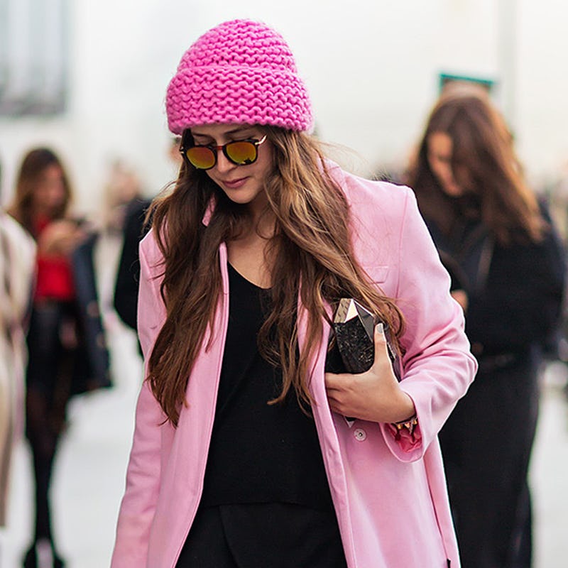 Prepping your strands starts in the shower. Lather up with a gentle moisturizing shampoo geared toward fragile and dry hair. Make sure hair is completely dry before putting on a hat—dampness is the No. 1 cause of flat locks.
