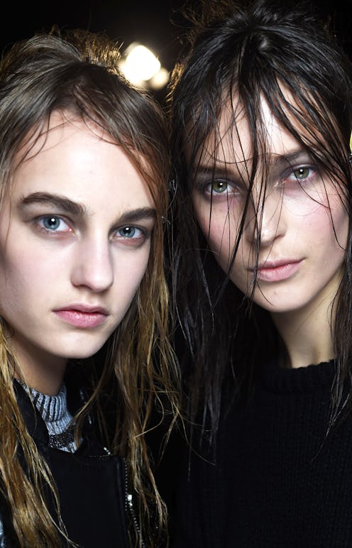 At Alexander Wang’s goth glam show, models were transformed into an “army of darkness” complete with studded platform creepers and wild, slicked hair. The makeup was pure rock-and-roll—think KISS and the Cure—and, without using mascara or eyeliner, makeup artist Diane Kendal achieved a party-ready smoky eye.