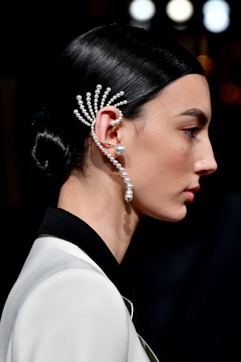 There was a similar, structural chignon at Prabal Gurung's Fall 2020 show. "I find chignons can be repetitive and boring," says Laurent Phillipon, lead hairstylist for Bumble and Bumble. To combat that, he opted for a low, tight, slick chignon that was super shiny.