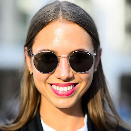 Pick a pair of round sunglasses in a bright pink and match it with an equally bright and flirty lipstick.