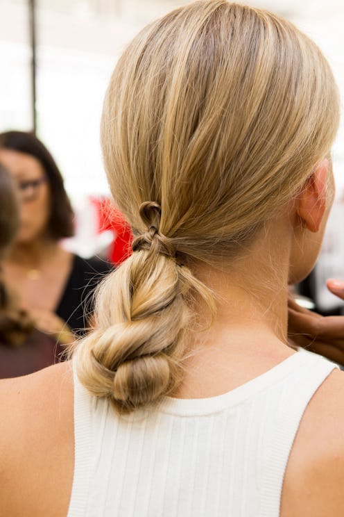 Give everyday plaits a face-lift in less than five minutes. Pull hair into a low ponytail and braid to the ends. Fold the braid in half and secure with a thin elastic. Wrap a small section of hair around the base to hide the elastic.