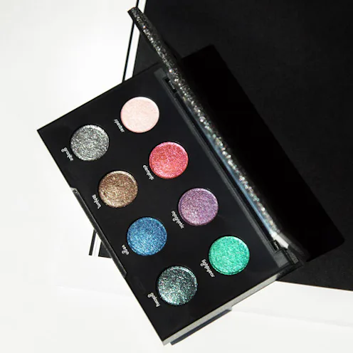 On the top left, we have Spectar, a light peach pink, then a fiery red with an opalescent effect called Element—it looks like an actual space gem, probably from Mars. The next shade, Magnetic, is a light purple that doesn’t hold back with its vibrancy, followed by Lightyear, one of the most saturated greens we’ve ever seen. The bottom row is where things get really interesting. All the way to the right on the bottom there’s Granite, a deep silver that’s perfect for a festive night out. Next to it is Lithium, a shiny gold that will look insanely good with some black liner. Vega is a bright electric blue that adds a nice jolt to the palette. And finally, all the way to the left is Galaxy, probably our favorite color out of the entire palette. The glittery blue-gray shade will make for one of the most unique smoky eyes ever.