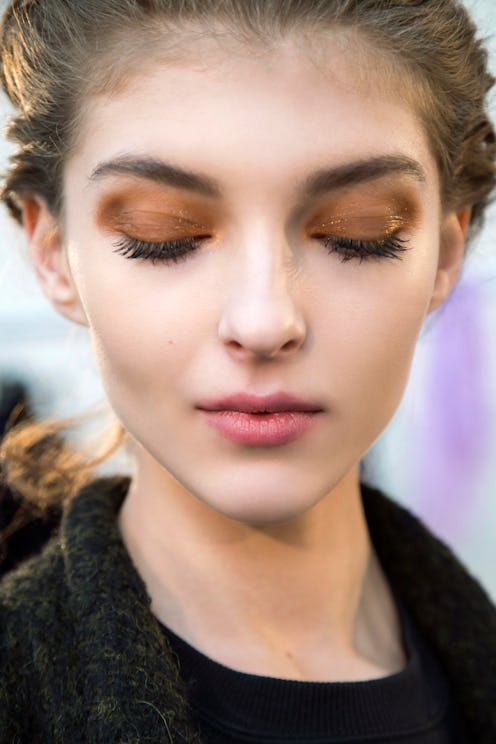 Lids washed in shades of copper with lots of shine will be everywhere this fall. Models backstage at Leonard oozed autumnal vibes with the natural shade.