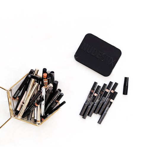 In her mini-tutorial, she impressively uses her pencil in three different ways, on three different parts of her face. First, she fills in spaces in her arches that need some color using a thin, rounded pencil and a spooley brush. Then she moves on, adding faux freckles to her cheeks and chin—a great way to cover blemishes or scarring. Lastly, she uses her pencil as eyeliner beneath her waterline, imparting a subtle brown tint.