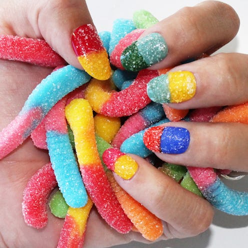 Step 1: Paint each nail a different color. Stick to bright shades that mimic gummy worms.