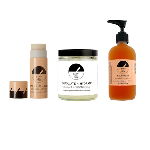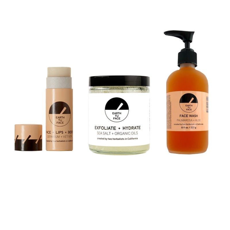 Availability: Earth Tu Face Skin Stick, $34; Sea Salt Body Scrub, $44; Palmarosa + Aloe Face Wash, $48.
