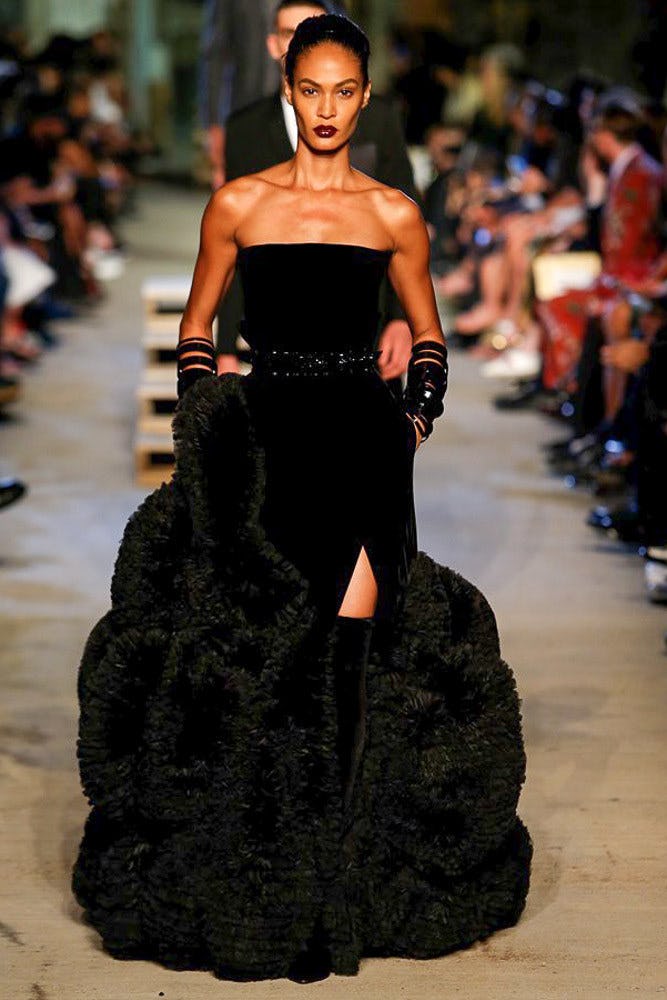 Was there any doubt that today’s top pick would be anything but Givenchy? The house’s NYFW debut was the most anticipated event of the week and it did not disappoint. Riccardo Tisci’s dramatic show brought a level of artistry and pageantry that would make Lee McQueen proud. The models paraded down the runway in nude and metallic palettes with bleached eyebrows and slick, center-parted hair. But the standout look was on Joan Smalls. Wearing a voluminous black dress, the striking model had perfectly dewy skin and a scene-stealing deep plum lip. The effect was breathtaking and it earns our today’s stop spot for beauty.