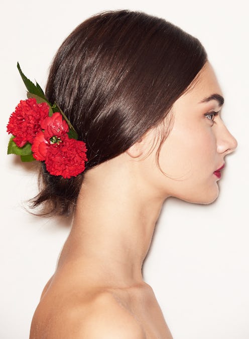 Look like a model in no time with this easy-to-create look. Sweep hair back into a loose bun and pin at the nape of the neck. Add a touch of romance to your style with a red flower appliqué.