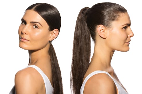 Create structure and grip with hairspray while styling the ponytail. Finish by smoothing an anti-frizz serum or hair oil generously over the crown and lightly over the length of the ponytail. L'Oreal Elnett Satin Strong Hairspray, $15; Dove Nourishing Oil Care Anti-Frizz Serum, $7.