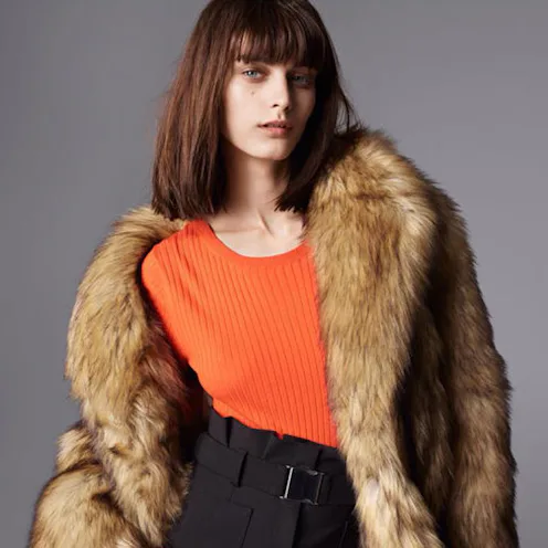 "Today I’m wearing an insanely fluffy alpaca jumper from Whistles, raw indigo cropped jeans from Acne and bright-blue Miu Miu shoes, with my new Whistles cream shearling jacket."