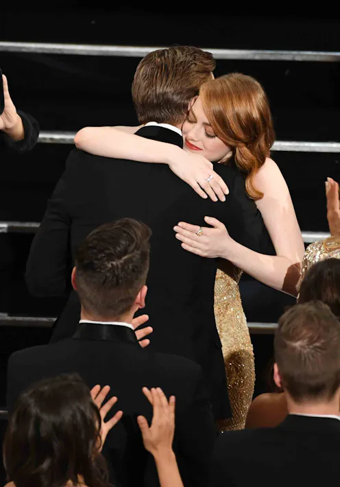 Andrew wasn’t the only crush-worthy man gazing adoringly at Emma last night, either. She and her La La Land co-star Ryan shared shared some very cute moments, like the hug pictured above, and we couldn’t help but feel our hearts skip a beat watching Leo beam at her as well. She is definitely living her best life, and we’re not mad at it. Not mad at all.