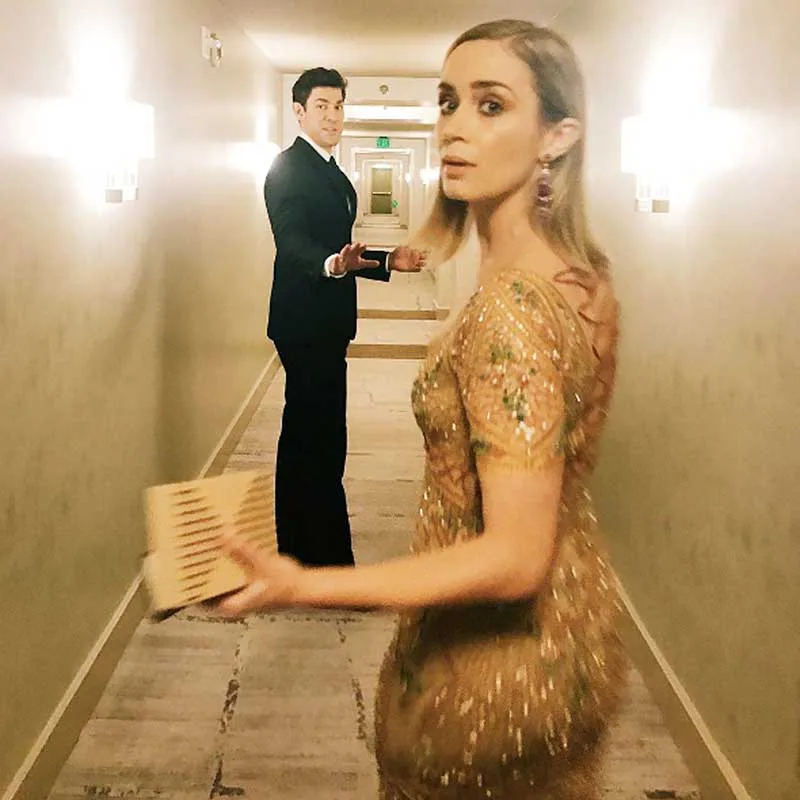 Emily Blunt and John Krasinski leaving their hotel room for the 2017 SAG Awards.