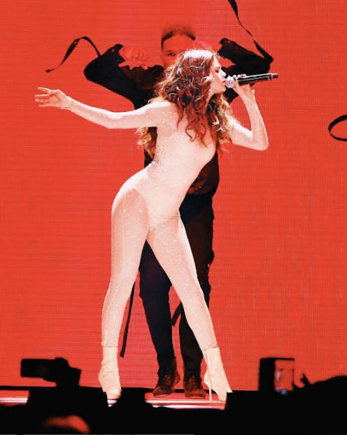 Halfway through the set, Gomez toned down the palette but not the wow-factor in this nude body suit, a sheer cardigan and stiletto platform heels.