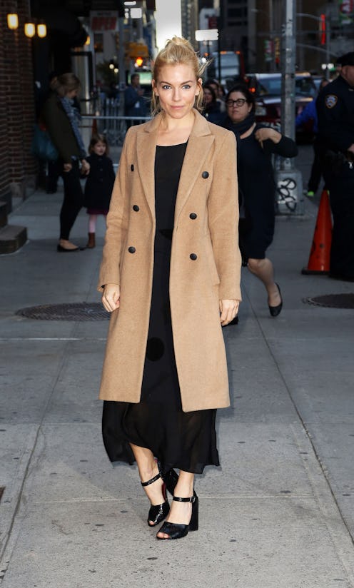 A structured camel coat sharply pulls together a night-out look, whether over a cocktail dress or sultry separates. Sienna Miller broke up her all-black ensemble with this double-breasted Rag & Bone topper.