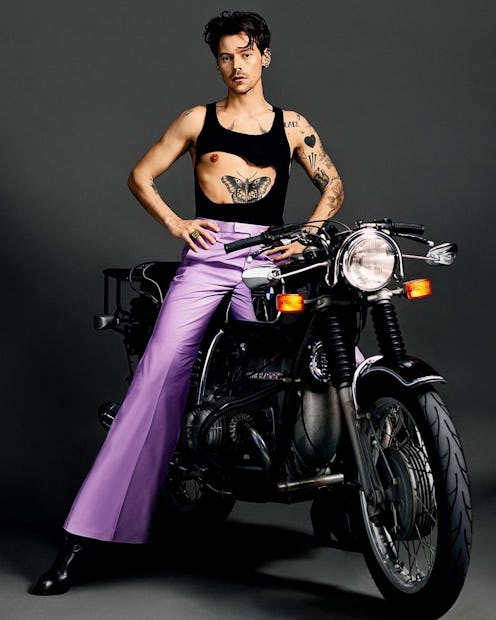 Styles has been wearing nail lacquer for years and it’s since become a signature part of his look. His favorite design is seemingly a multi-colored manicure like the one he rocked at the 2019 Met Gala. “It’s starting with nail polish, because that was kind of the birth of what it was for,” Styles told Dazed. “Me seeing a color on a flower or a wallpaper or something and thinking, ‘Oh, I wanna put that on my nails.’”