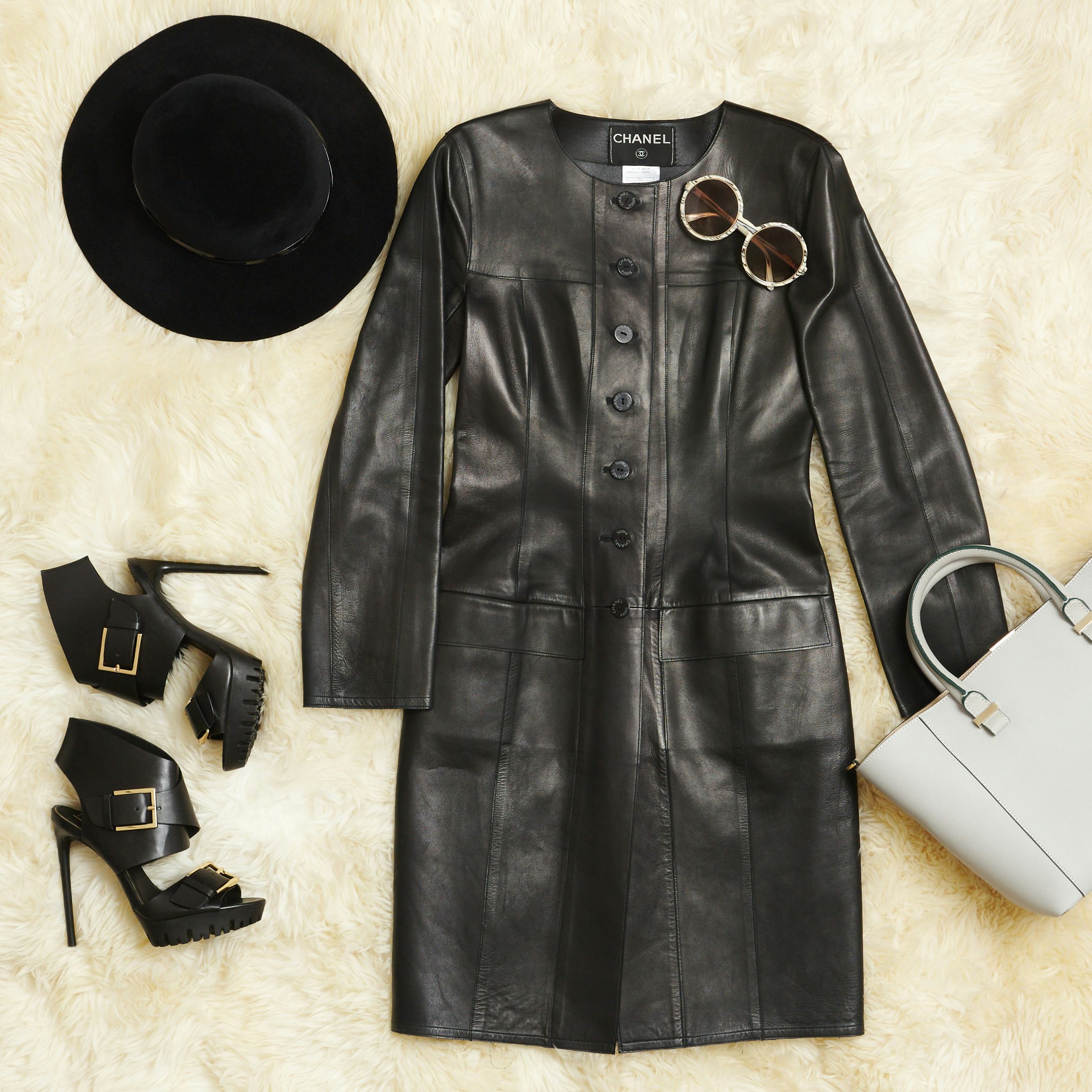 This polished look is a strong way to finish Fashion Week, as well as a chic travel outfit if London is your next destination (or if you're just heading home). Rachel's mod-inspired ensemble is comprised of a vintage Chanel leather jacket, Victoria Beckham tote, Eric Javits felt hat, Tom Ford sunglasses and Rachel Zoe Collection sandals.